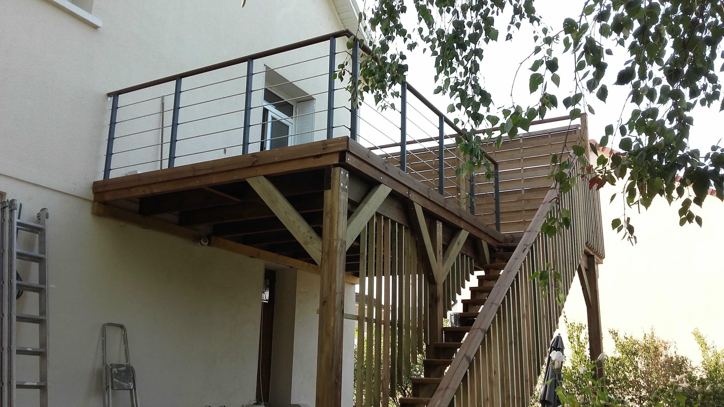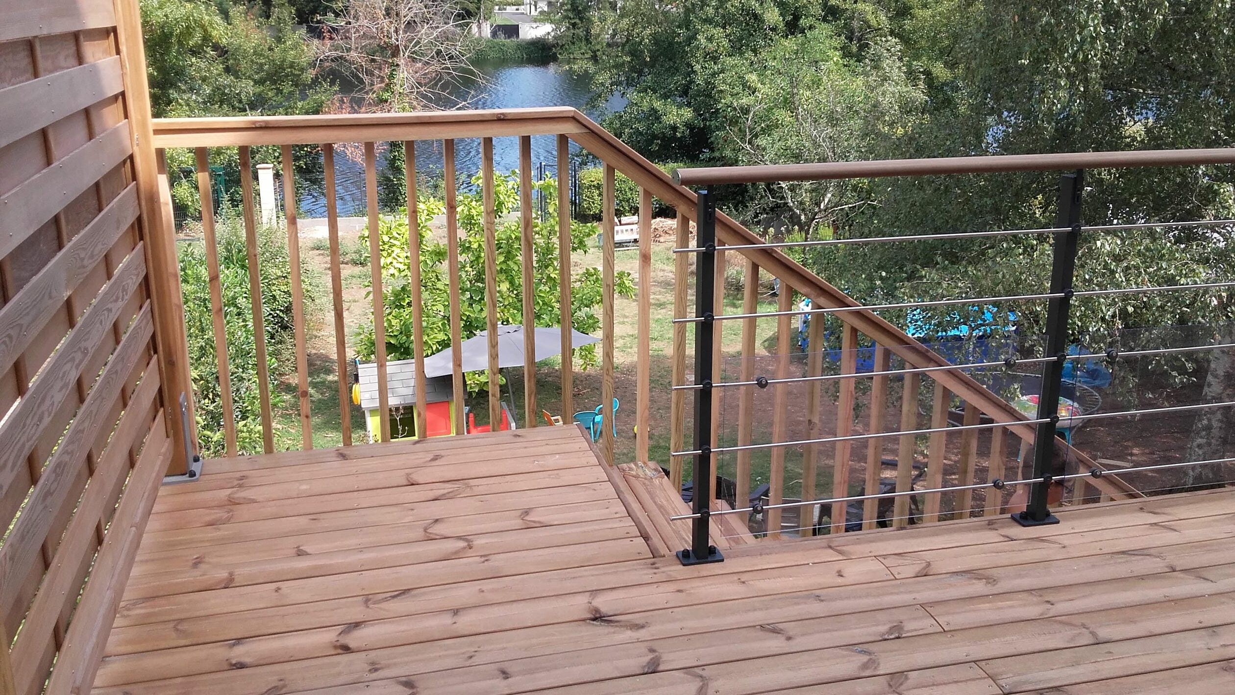 Terrasse en bois sur pilotis avec escalier, garde-corps et pare-vue à Châtellerault